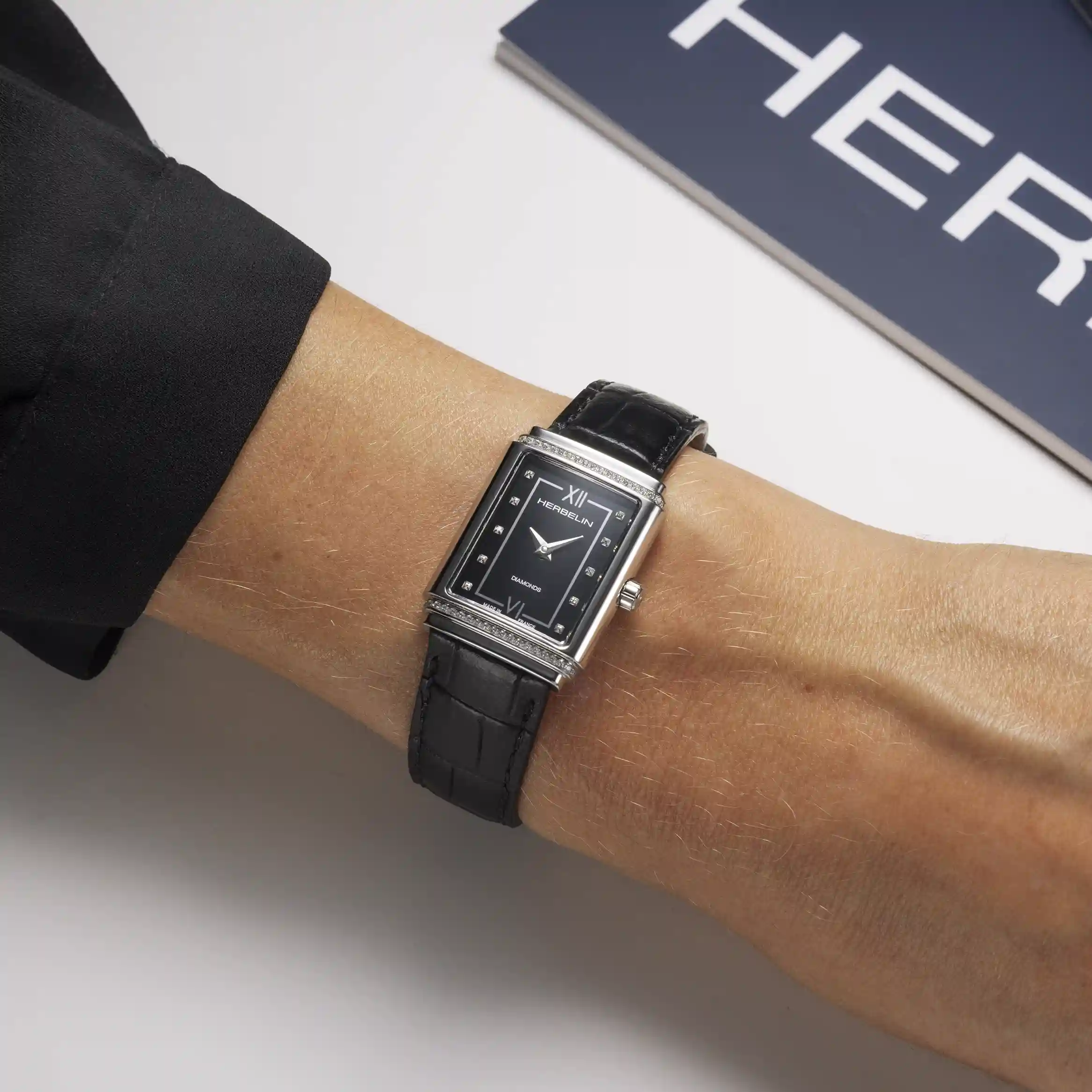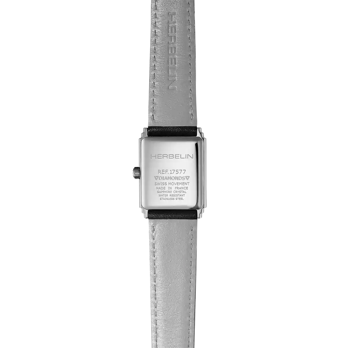 Sophistiquée et précieuse, ART DÉCO 1925’S cadran noir & index diamants illustre le savoir-faire joaillier et horloger de la Maison Herbelin. Inspirée par l’esthétique géométrique des années 20, elle séduit par son boîtier rectangulaire en acier inoxydable 316L, délicatement serti de véritables diamants.