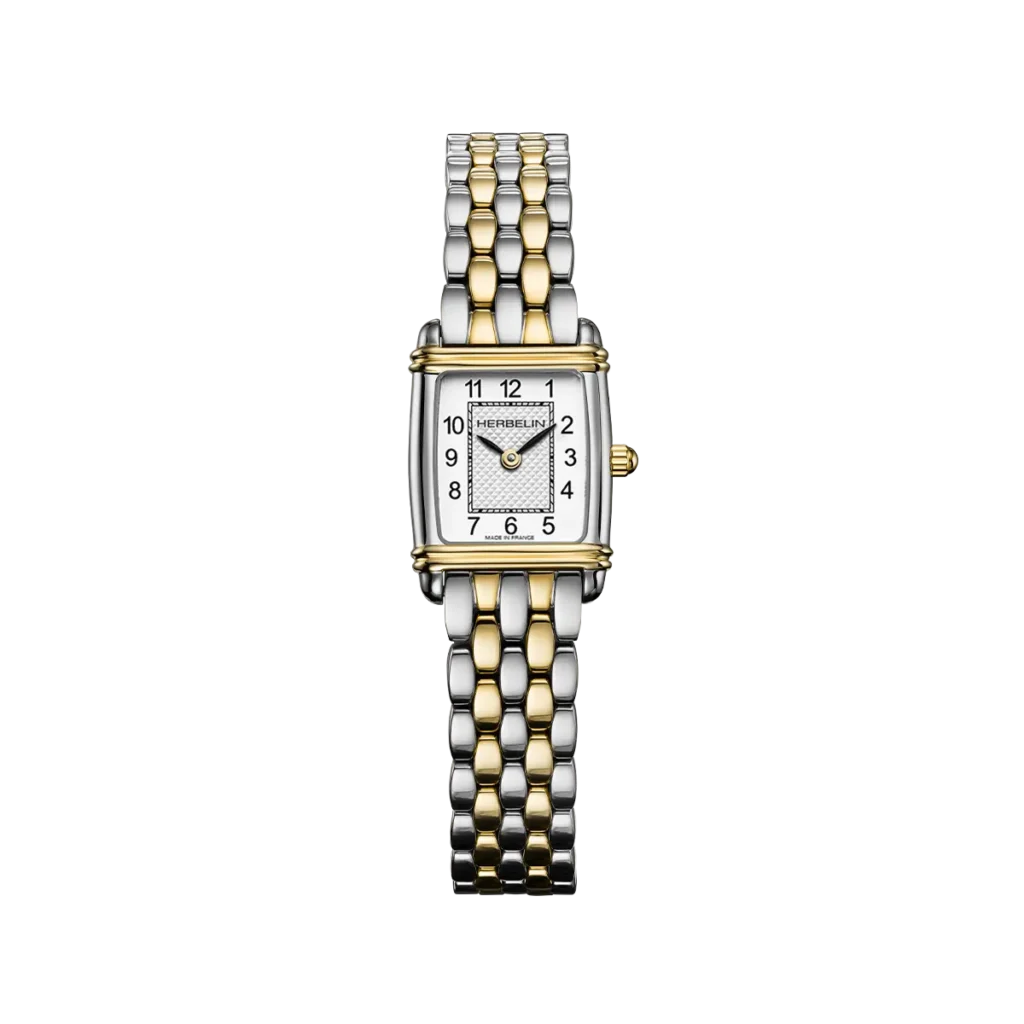Son bracelet bicolore en acier inoxydable et PVD Or Jaune apporte une touche de modernité et de polyvalence, faisant de cette montre un véritable bijou à porter seul ou en accumulation avec d’autres accessoires.