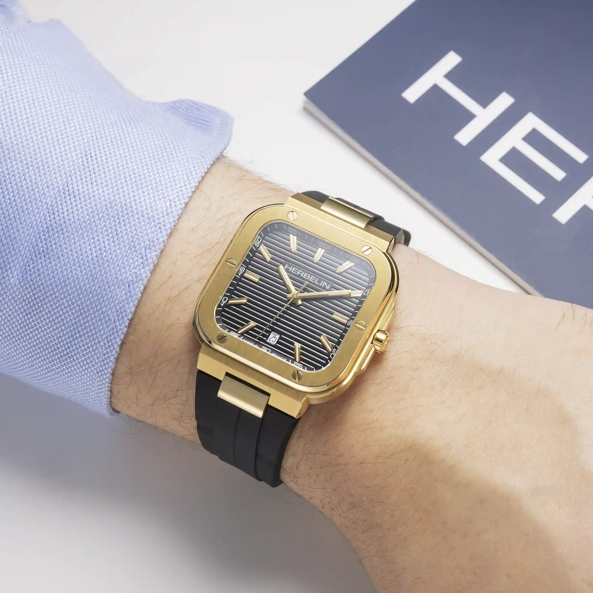 CAP CAMARAT SQUARE Quartz Noir & PVD Or 1N s’impose par son caractère affirmé et élégant. Son boîtier carré en acier 316L revêtu de PVD or jaune 1N souligne la profondeur d’un cadran noir texturé horizontalement. Cette pièce, aussi chic que sportive, allie finesse (7,8 mm), robustesse et étanchéité 100 m. Équipée d’un verre saphir inrayable et d’un bracelet en FKM noir à boucle ardillon, elle incarne l’élégance contemporaine. Propulsée par un mouvement quartz suisse Ronda, cette montre promet précision et fiabilité au quotidien.