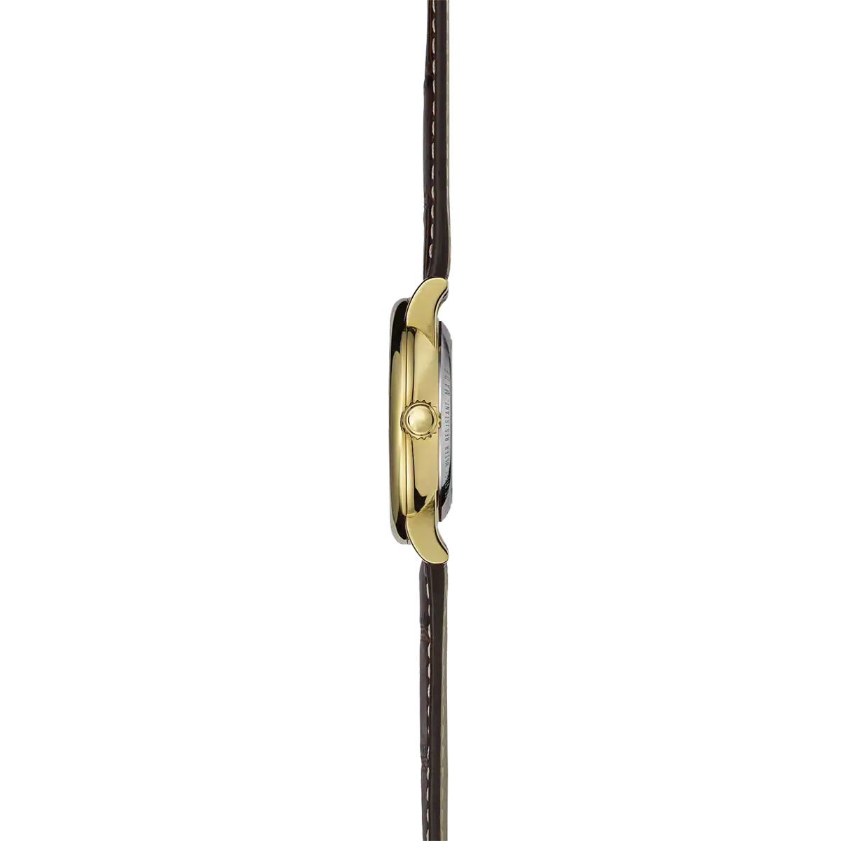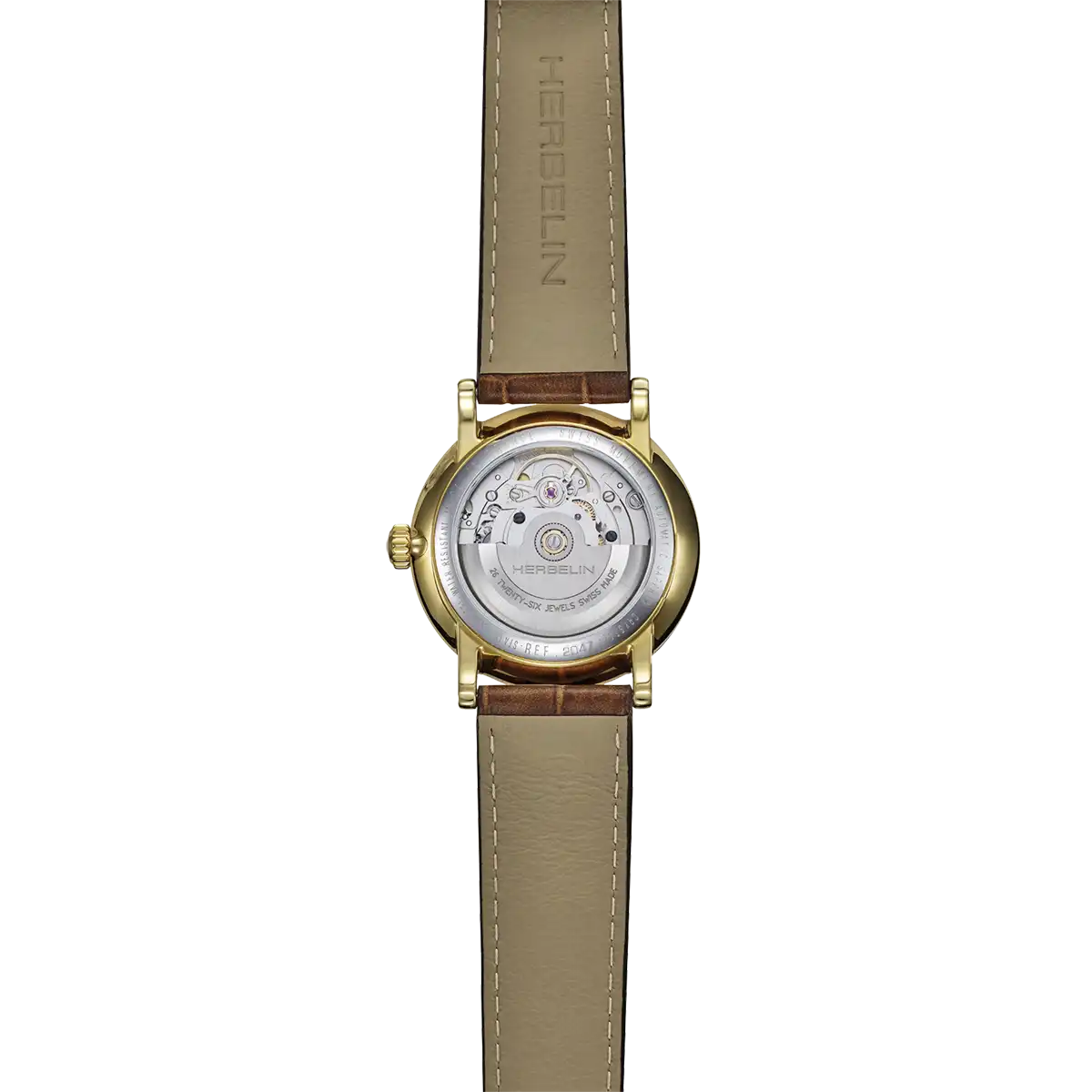 Raffinée et lumineuse, cette montre Inspiration Automatique habillée de PVD or jaune incarne une interprétation élégante et contemporaine de l’horlogerie classique selon HERBELIN. Son boîtier rond aux lignes harmonieuses, sublimé par un revêtement PVD or jaune, confère à ce modèle une présence chaleureuse et sophistiquée, parfaitement équilibrée par un diamètre de 38 mm.