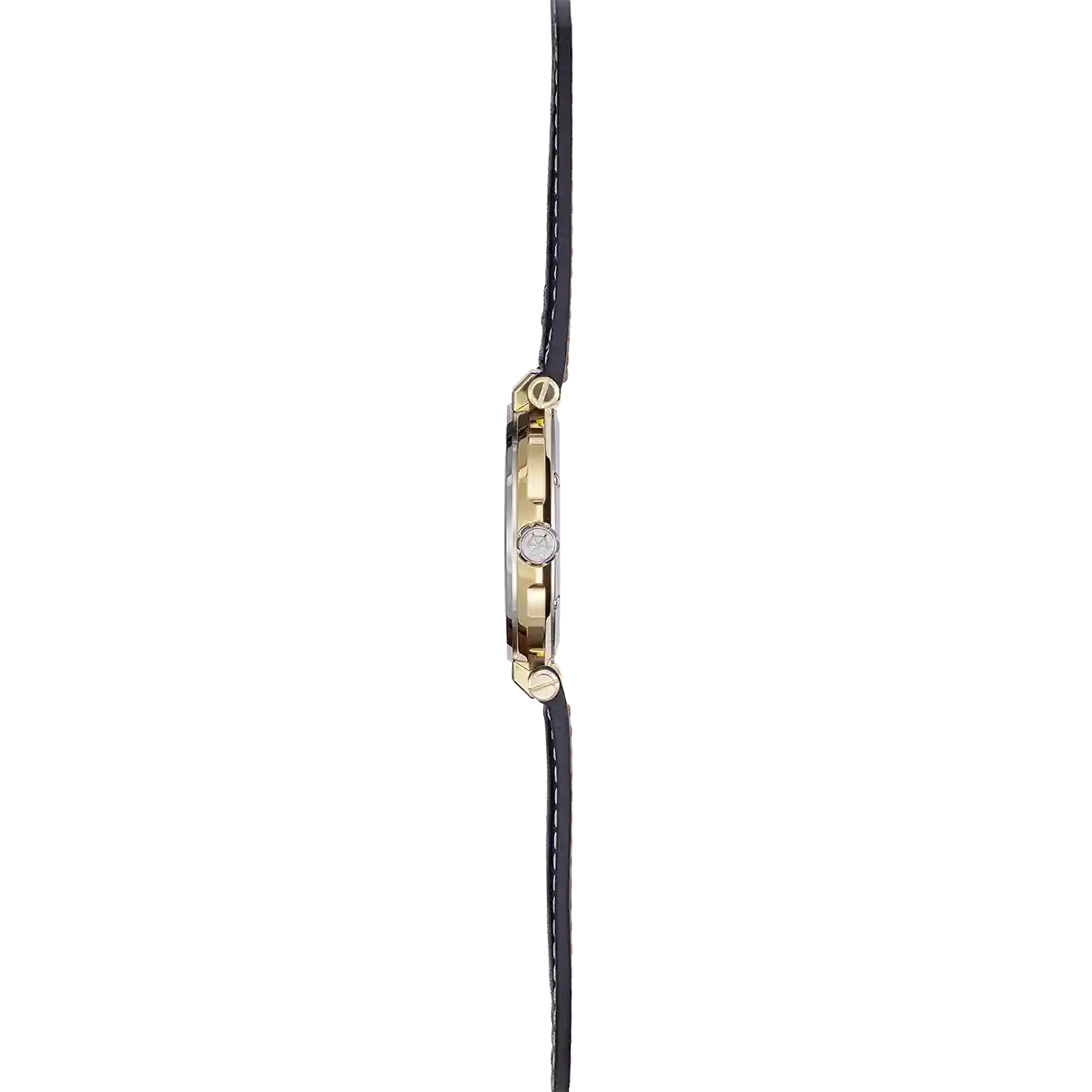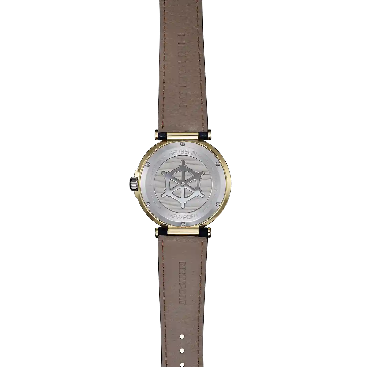 NEWPORT Cuir Bleu & PVD Or incarne l’élégance sportive chère à Herbelin. Son boîtier de 40,5 mm en acier 316L rehaussé de PVD or jaune s’accorde à un cadran bleu profond, orné de six vis décoratives sur la lunette emblématique de la collection.