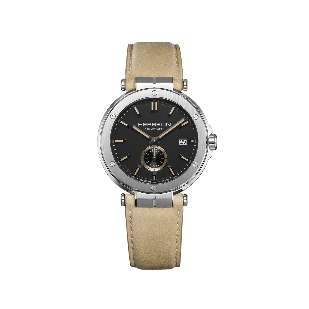 Icône de l’univers marin HERBELIN, la collection Newport se réinvente à travers un design à la fois sportif et élégant. Cette montre quartz séduit par son boîtier rond en acier inoxydable 316 L, aux finitions soignées, et par son cadran noir mat structuré, animé par une petite seconde et un guichet date discret.