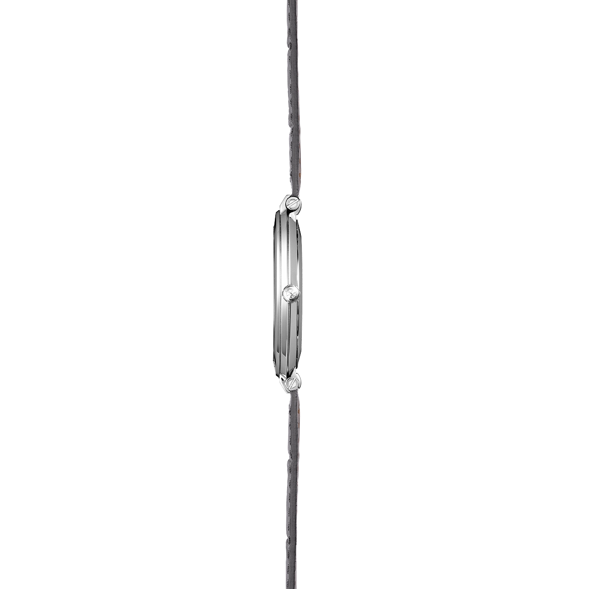 Le bracelet en cuir façon croco, de couleur gris anthracite, complète cette pièce horlogère de choix, en lui conférant une touche d’élégance intemporelle. Alliant confort et style, ce bracelet s’ajuste parfaitement au poignet, renforçant l’allure distinguée de ce modèle. Les attaches centrales et la couronne gravée d’une roue marine, symboles emblématiques de la collection Newport, accentuent son identité unique.